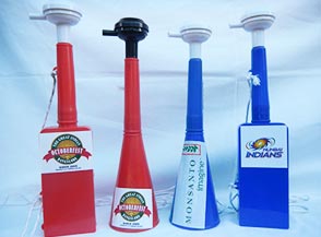 We manufacture a cheering horn in the shape of a Cricket Bat and with custom stickers. These are light weight and are allowed to be taken inside a cricket stadium.