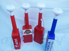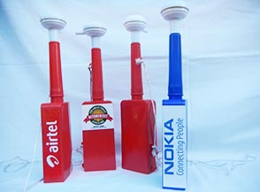 We manufacture a cheering horn in the shape of a Cricket Bat and with custom stickers. These are light weight and are allowed to be taken inside a cricket stadium.